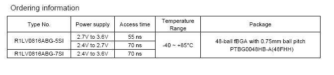 The R1LV0816ABG is a family of low voltage 8-Mbit static RAMs organized as 524,288-words by 16-bit,fabricated by Renesas's high-performance 0.15um CMOS and TFT technologies.