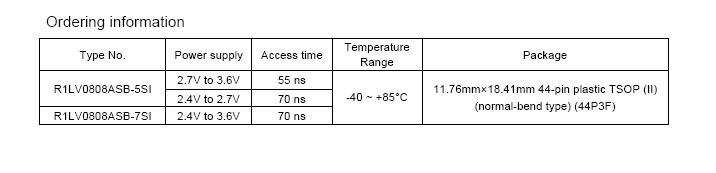 The R1LV0808ASB is packaged in a 44pin thin small outline mount device [11.76mm×18.41mm 44-pin plastic TSOP (II)]. It gives the best solution for a compaction of mounting area as well as flexibility of wiring pattern of printed circuit boards.