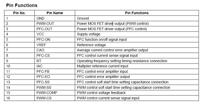 The PFC operation can be turned on and off by an external control signal. Use of this on/off function makes it possible to disable PFC operation at a low line voltage, or to perform remote control operation from the transformer secondary side.