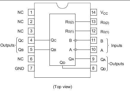 This counter contains four master-slave flip-flops and additional gating to provide a divide-by-two counter and divideby-eight counter. This counter has a gated zero reset. To use the maximum count length of this counter, the B input is connected to the QA output. The input count pulses are applied to input A and the outputs are as described in the appropriate function table.