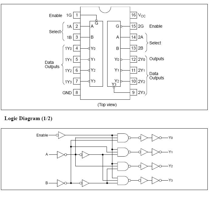 The HD74HC139 contains two independent two-to-four-line decoders each with a single active low enable input (1G or 2G). Data on the slect inputs (1A and 1B or 2A and 2B) cause one of the four normally high outputs to go low