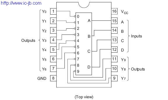 This BCD-to-decimal decoder / driver consists of eight inverters and ten four-input NAND gates. The inverters are connected in pairs to make BCD input data available for decoding by the NAND gates. Full decoding of valid BCD input logic ensures that all outputs remain off for all invalid binary input conditions. This decoder features highperformance,n-p-n output transistors designed for use as indicator / relay drivers or as open-collector logic-circuit drivers.