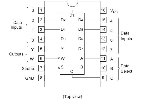 This data selector / multiplexer contains full-on chip binary decoding to select the desired data source. The HD74LS151 selects one-of-eight data sources and has a strove input, which must be at a low logic level to enable this device. A high level at the strove forces the W output high, and the Y output low.