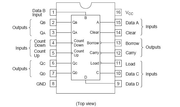 coincidently with each other when so instructed by the steering logic. This mode of operation eliminates the output counting spikes which are normally associated with asynchronous (ripple clock) counters. The outputs of the four master-slave flip-flops are triggered by a low-to-high-level transition of either count (clock) input. The direction of counting is determined by which count input is pulsed while the other count input is high. This counter is fully programmable; that is, each output may be preset to either level by desired data at the data inputs while the load inputs is low. The output will change to agree with the data inputs independently of the count pulses. This feature allows the counters to be used as modulo-N dividers by simply modifying the count length with the preset inputs. A clear input has been provided which forces all outputs to the low level when a high level is applied. The clear function is independent of the count and load inputs. The clear, count, and load inputs are buffered to lower the drive requirements.This reduces the number of clock drivers, etc., required for long words. This counter was designed to be cascaded without the need for external circuitry. Both borrow and carry outputs are available to cascade both the up-and downcounting functions. The borrow output produces a pulse equal in width to the count-down input when the counter underflows. Similarly,