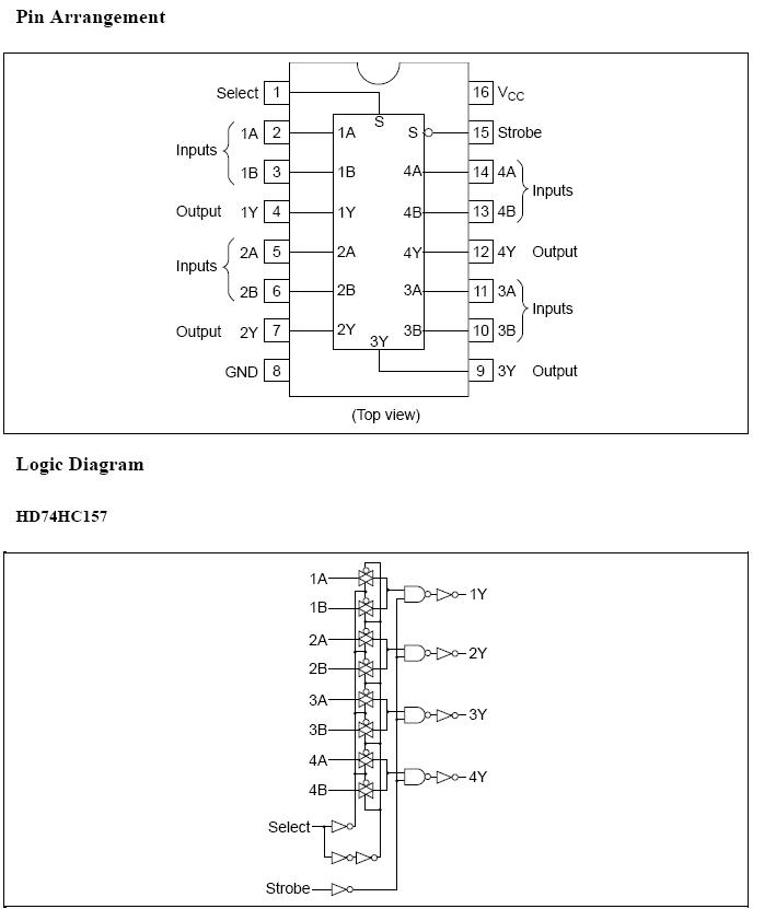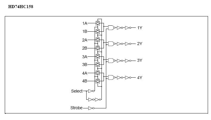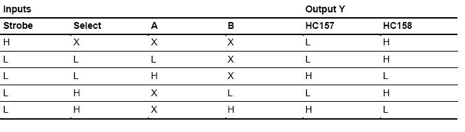 These devices each consist of four 2-input digital multiplexers with common select and strobe inputs. On the HD74HC157, when the strobe input is at logical “L” the four outputs assume the values as selected from the inputs. When the strobe input is at a logical “H” the outputs assume logical “L”. The HD74HC158 operates in the same manner, except that its outputs are inverted. Select decoding is done internally resulting in a single select input only. If enabled, the select input determines whether the A or B inputs get routed to their corresponding Y outputs.