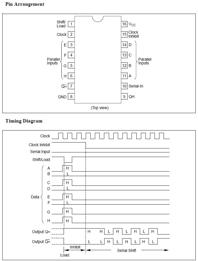 Clocking is accomplished through a 2-input NOR gate permitting one input to be used as a clock inhibit function. Holding either of the clock inputs high inhibits clocking, and holding either clock input low with the Shift/Load input high enables the other clock input. Data transfer occurs on the positive going edge of the clock. Parallel loading is inhibited as long as the Shift/Load input is high. When taken low, data at the parallel inputs is loaded directly into the register independent of the state of the clock.