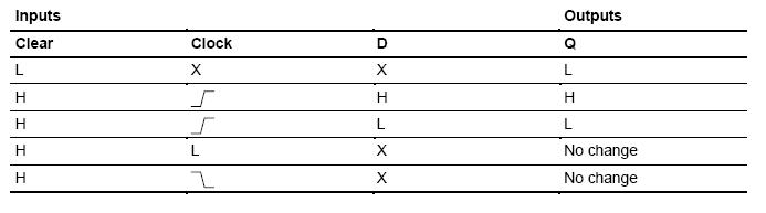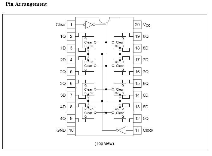 This device contains 8 master-slave flip-flops with a common clock and common clear. Data on the D input having the specified setup and hold times is transferred to the Q output on the low to high transition of the clock input. The clear input when low, sets all outputs to a low state.